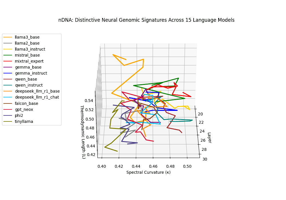 \[\boxed{ \underbrace{\text{Intrinsic curvature}}_{\kappa_\ell} \quad + \quad \underbrace{\text{Epistemic effort}}_{\mathcal{L}_\ell} \quad + \quad \underbrace{\text{External steering}}_{\|\mathbf{v}_\ell^{(c)}\|} \quad \Rightarrow \quad \text{nDNA: a unique fingerprint of neural inheritance.}}\]Its power lies not only in theoretical soundness [21] [17], but in its empirical capacity to disentangle inherited traits, zones of mutation, and ideological drift that no arbitrary metric combination could replicate.