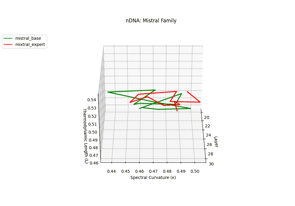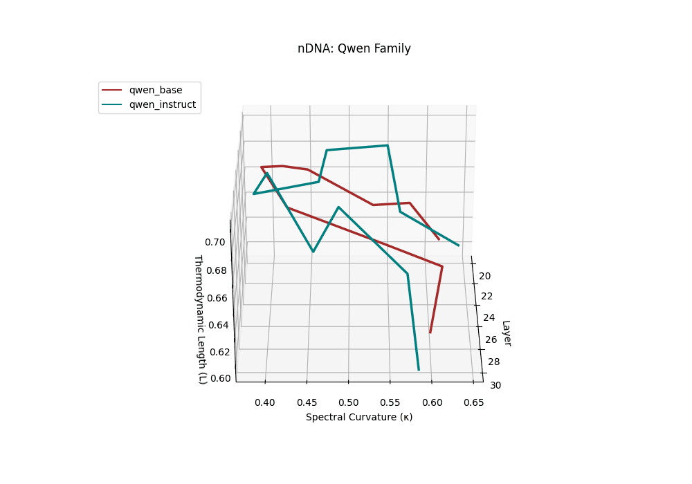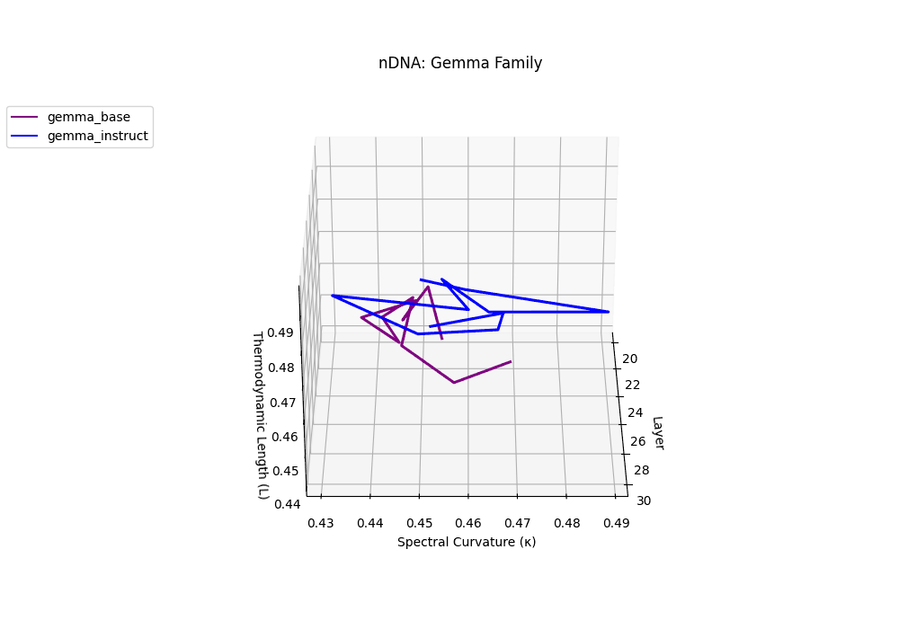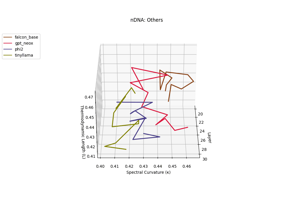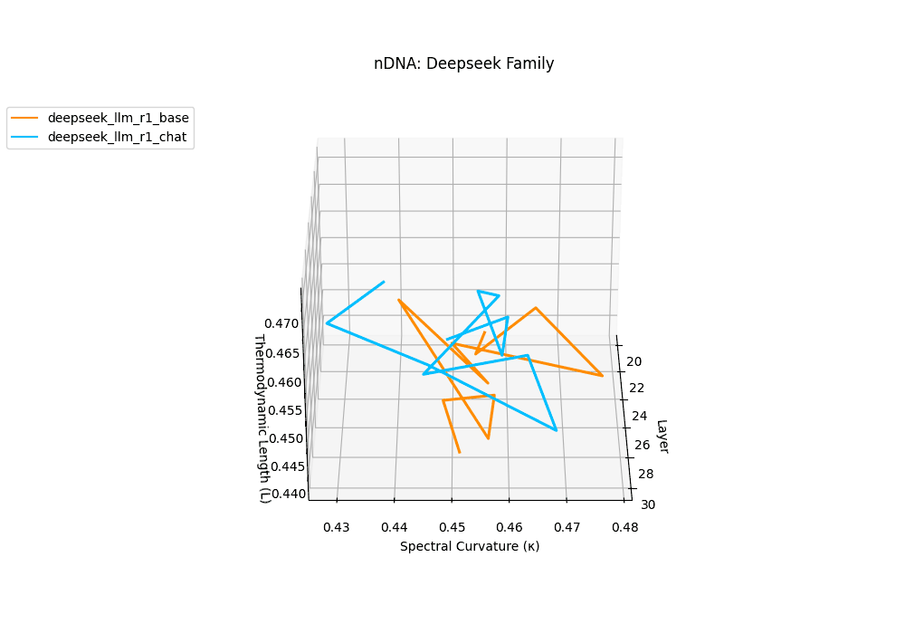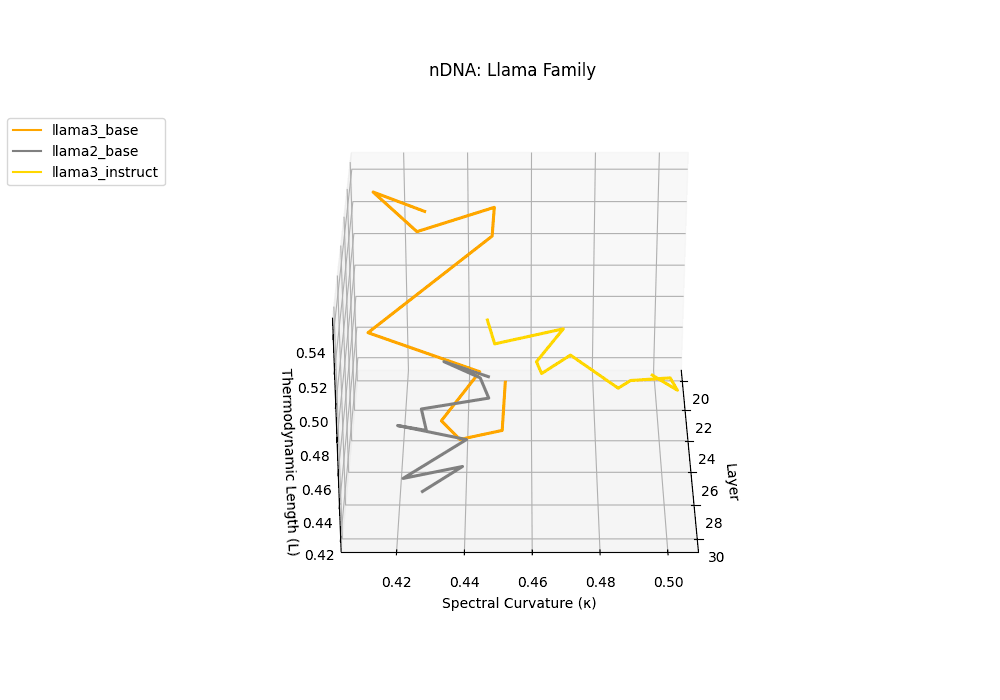 In this sense, nDNA is not a metaphor–it is a geometric genome: an intrinsic latent encoding of how a model thinks, adapts, and inherits. Where biological DNA encodes traits through molecular structure, nDNA encodes them through the curvature, length, and directional flow of latent belief trajectories. This geometry defines not only what the model produces–but how it knows what it knows.