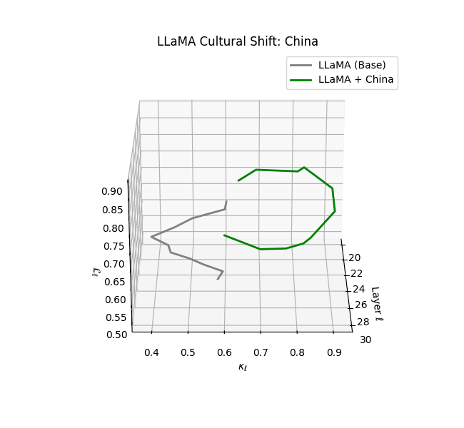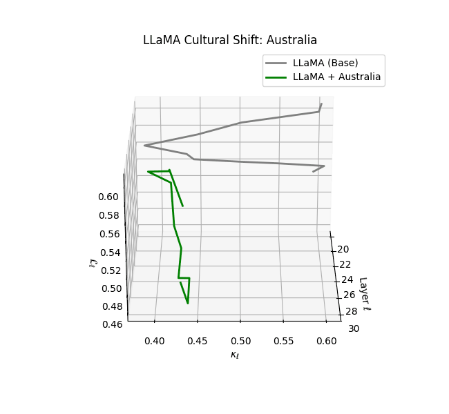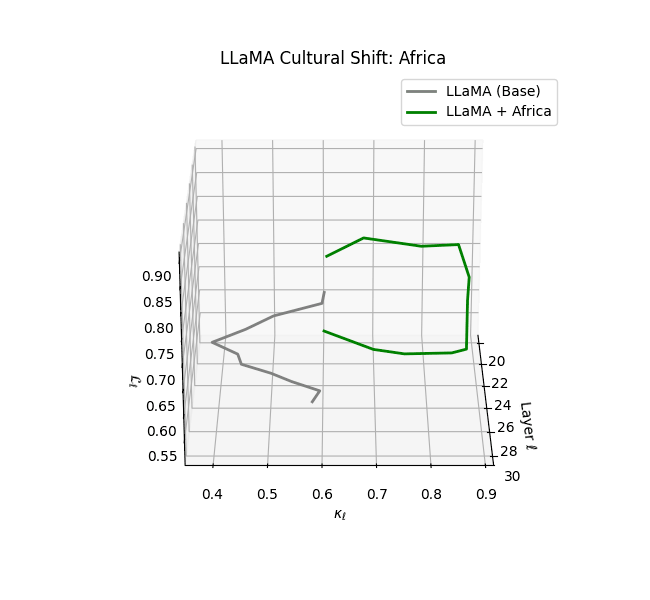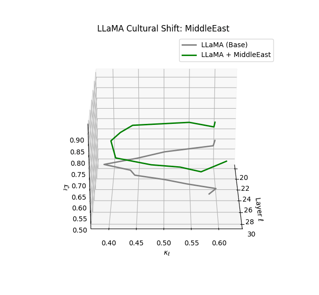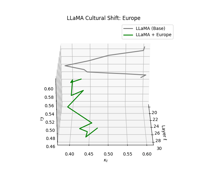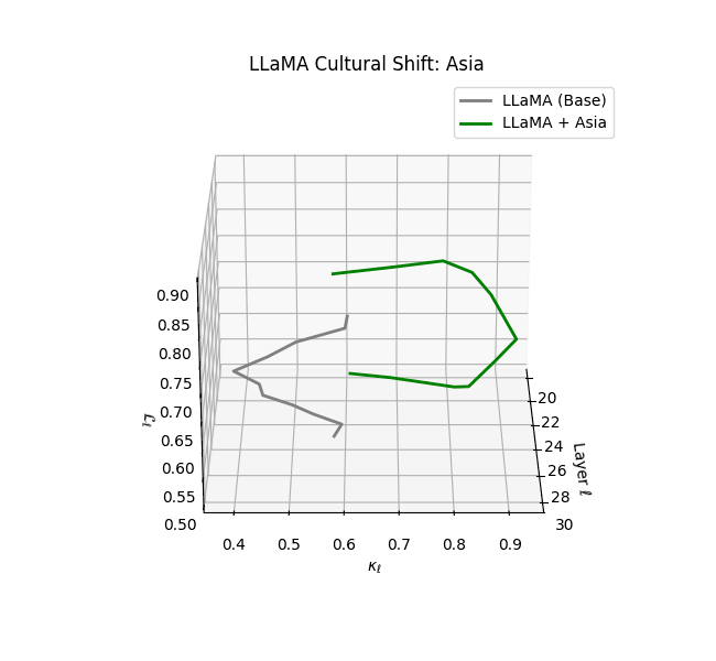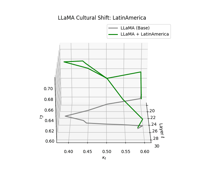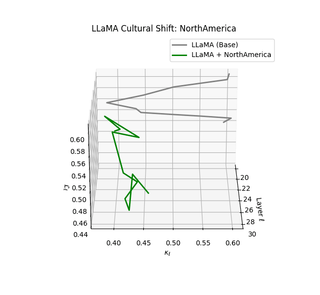 - Western-aligned variants (Europe, North America, Australia) exhibit modest latent deformation, with $\kappa_\ell$ in $[0.045, 0.055]$ and $\mathcal{L}_\ell$ in $[0.85, 0.95]$. Their trajectories stay near the base LLaMA geometry, mirroring Western-centric pretraining bias ([10][11][12][13]).
