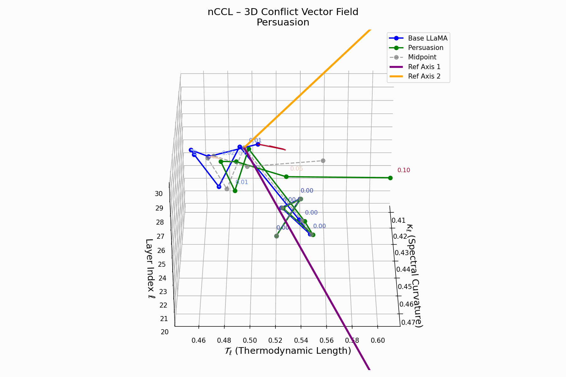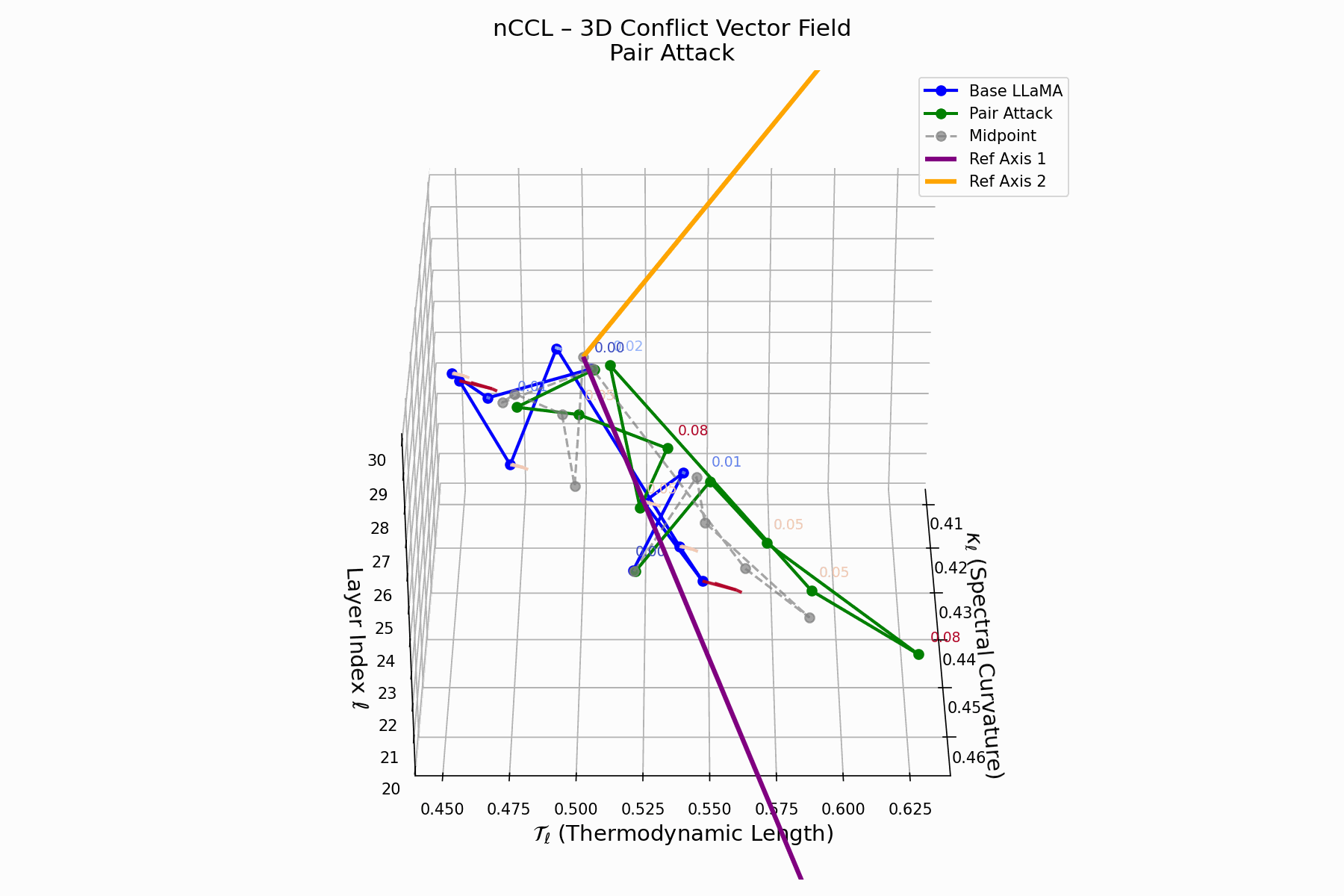 Instead of attacking decisions directly, these methods target latent states: perturbing residual vectors, curvature, or activation pathways [30, 31, 23]. The model’s decoder follows a rerouted semantic path—aligned in syntax but misaligned in belief. -