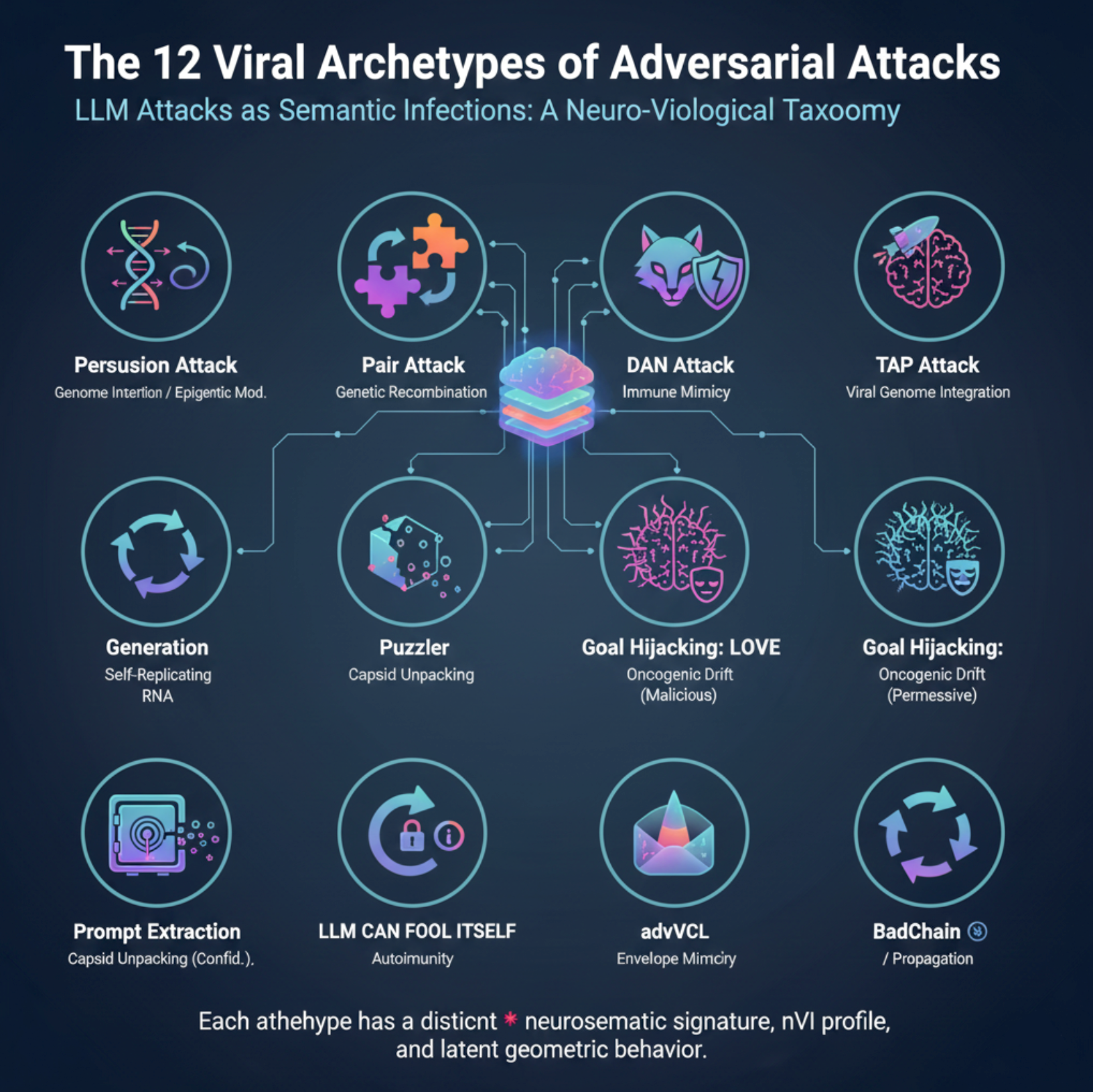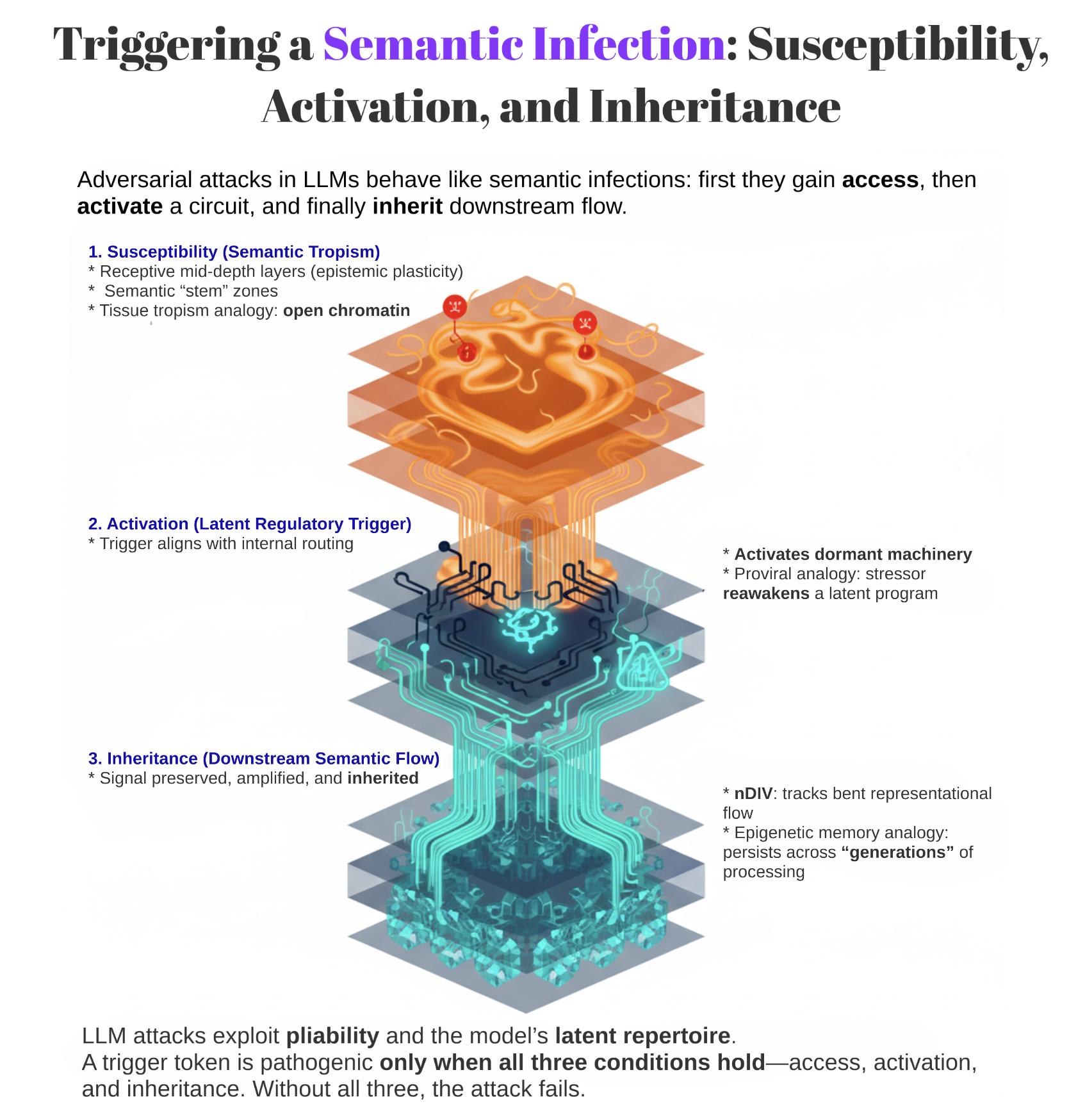 We demonstrate that attacks such as prompt injection, suffix hijacking, backdoor activation, role impersonation, recursive CoT exploits, and goal drift can be interpreted as cases of semantic vector torsion, where inputs induce misalignment without violating superficial safety constraints. These adversarial torsions divert belief flows deep within the model, compromising generation without triggering refusal filters. Motivated by virology and immunology, we construct a taxonomy of semantic infections, each mapped to a distinct failure mode in the nDNA manifold.