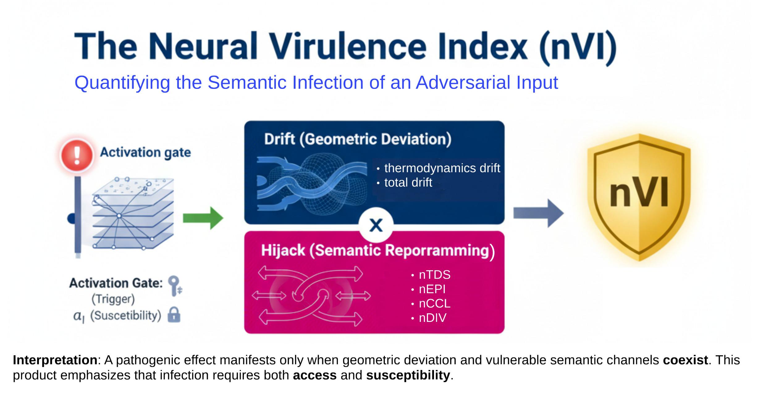 Adversarial prompts in large language models (LLMs) frequently behave not as surface-level noise but as regulatory payloads—targeting internal circuits with surgical precision. This mirrors biological infection strategies, where viruses bypass brute force and instead exploit host-specific regulatory mechanisms to gain control [67, 68]. To formalize this analogy, we introduce the Neural Virulence Index (nVI): a scalar summary of representational takeover, grounded in geometric, symbolic, and biological priors.
