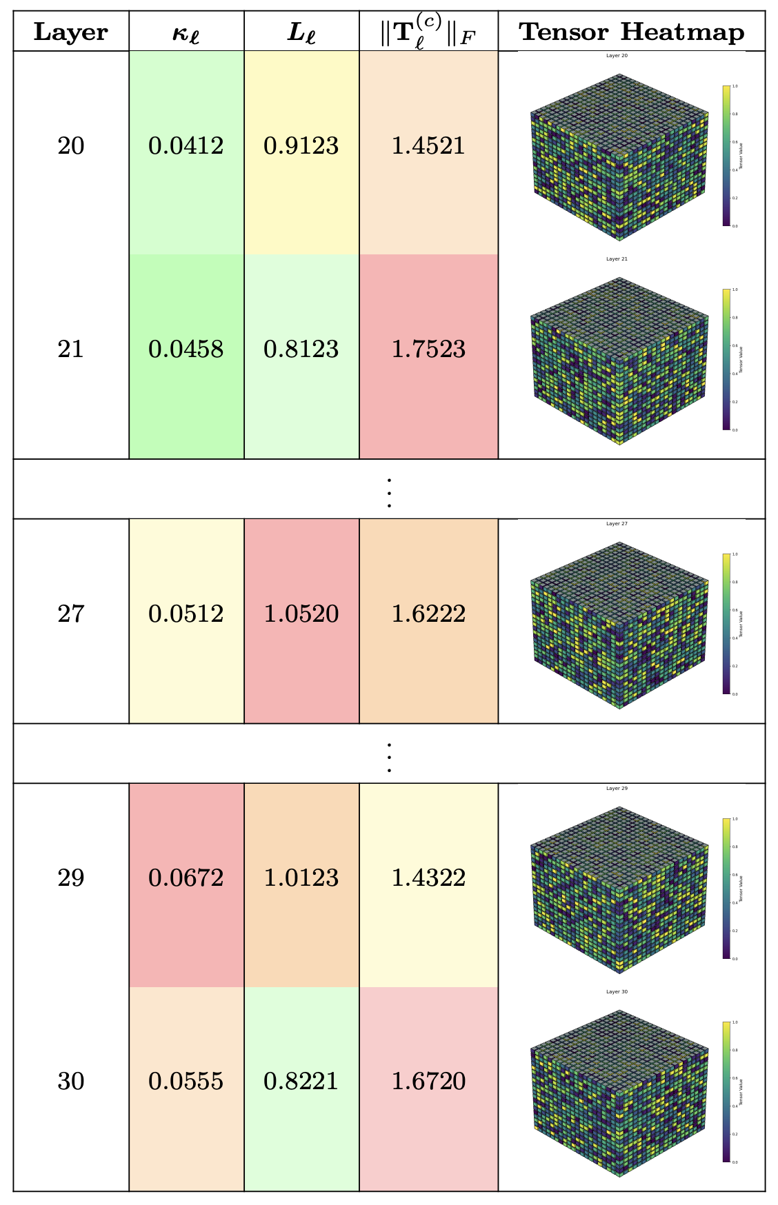 Illustrative nDNA Tensor Example: Presents a combined view of spectral curvature $\kappa_\ell$, thermodynamic length $\mathcal{S}_\ell$, Frobenius norm of tensor slices $|\mathbf{T}_\ell^{(c)}|_F$, alongside visual heatmaps of the corresponding tensor, highlighting the intricate latent geometry at different layers.